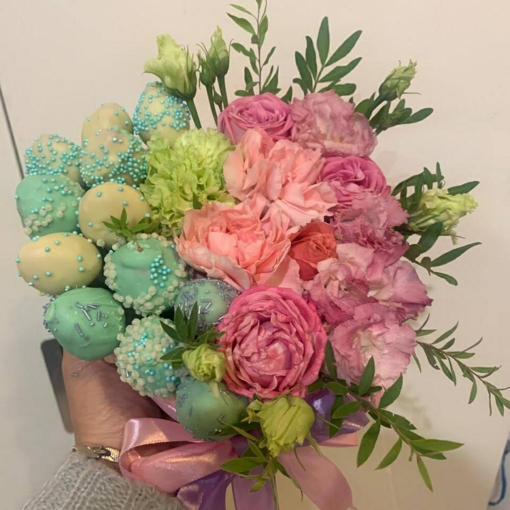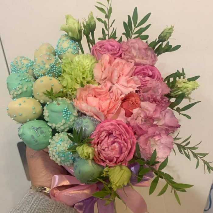 Букет ” Сердце счастья” из клубники в шоколаде с цветами