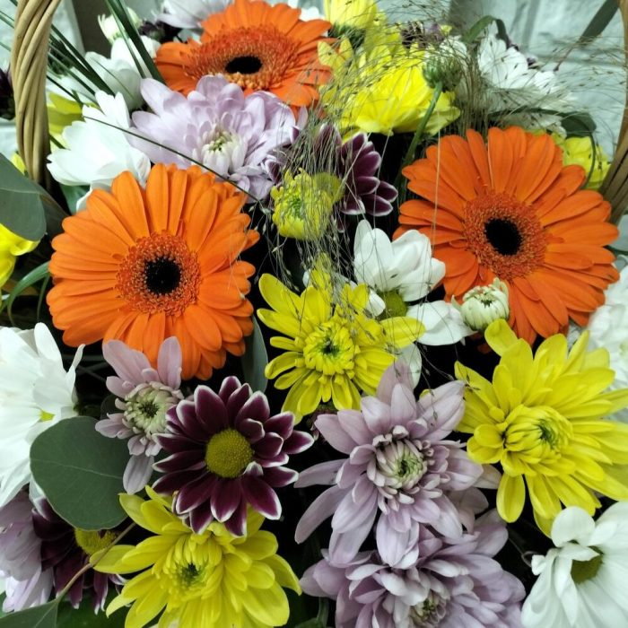 Эвкалипт – 2 шт.Лента атласная – 1 шт.Гербера мини – 3 шт.Оазис флористический – 1 шт.Хризантема кустовая микс – 5 шт.корзина плетенная средняя – 1 шт.Паникум Фонтан – 1 шт.
