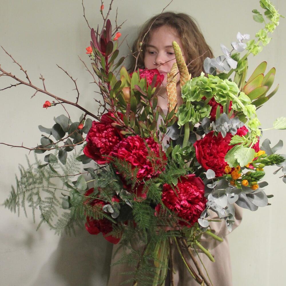 Алый – букет с пионами и ветвями