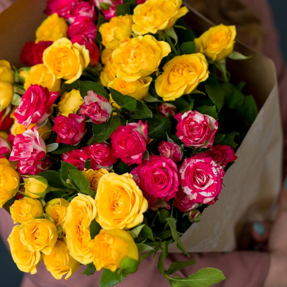 роза кустовая микс – 9 шт.Крафт упаковка – 1 шт.Лента атласная – 1 шт.