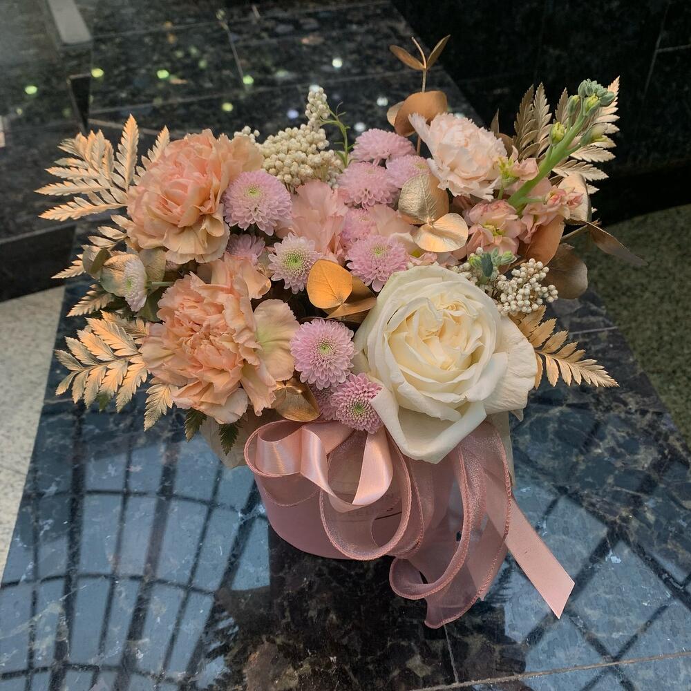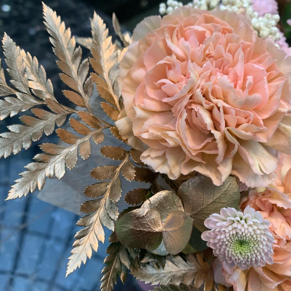 роза охара пионовидная ароматная – 1 шт.Диантус – 3 шт.Сантиния – 2 шт.Маттиола – 1 шт.Папоротник – 2 шт.Озотамнус – 1 шт.