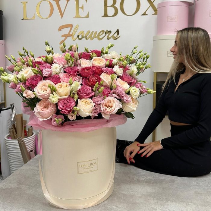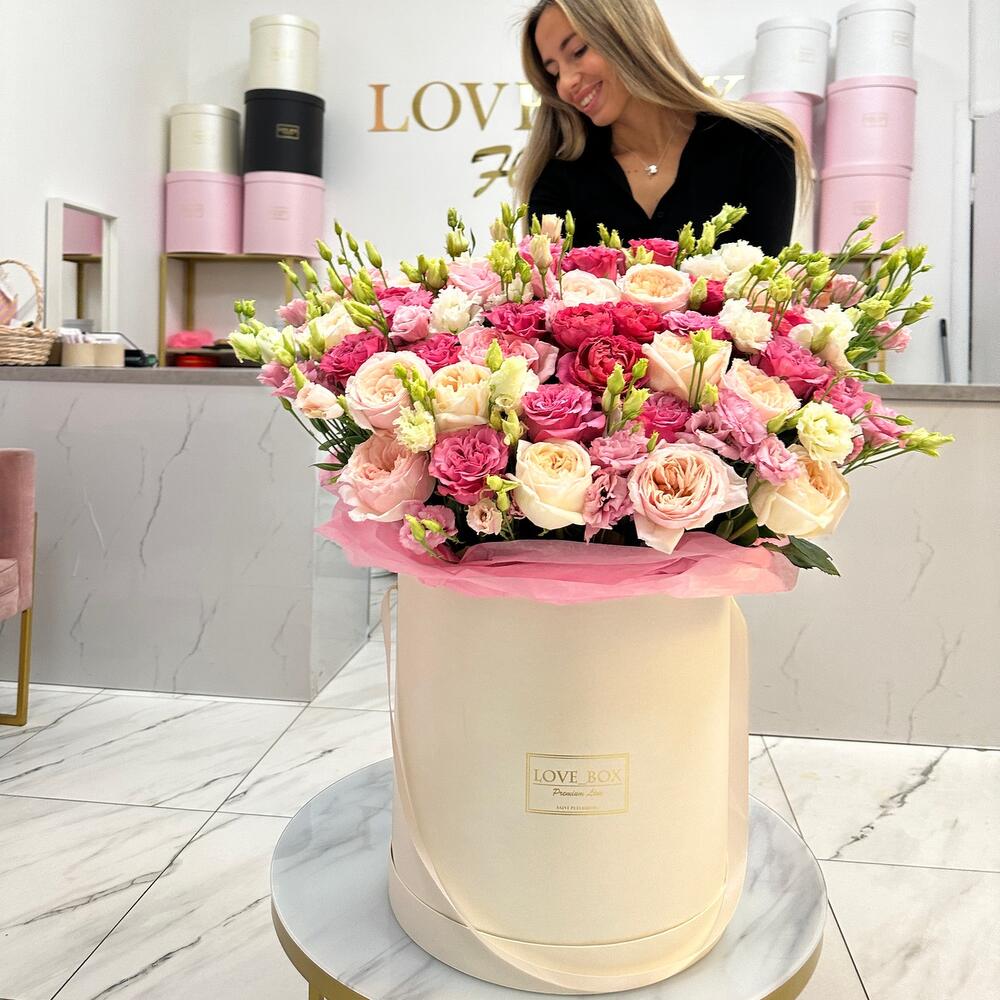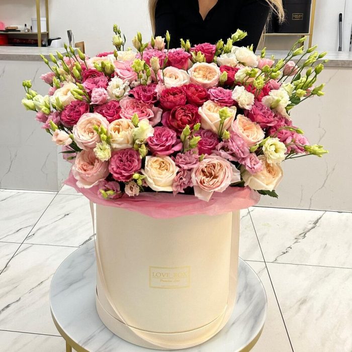 Роза пионовидная – 39 шт.Лизиантус – 19 шт.Кустовая роза – 9 шт.Шляпная коробка – 1 шт.
