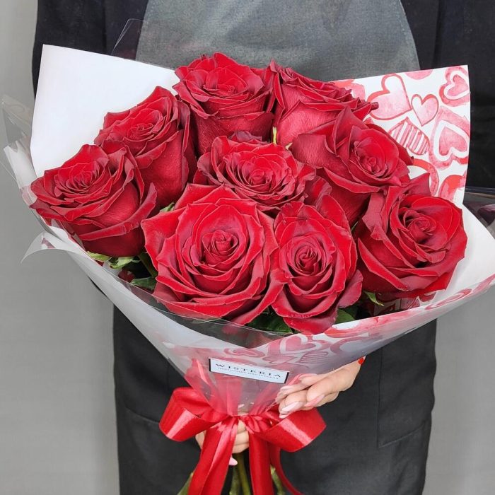 Лента атласная – 1 шт.Упаковка дизайнерская – 1 шт.Роза одноголовая эквадор – 9 шт.