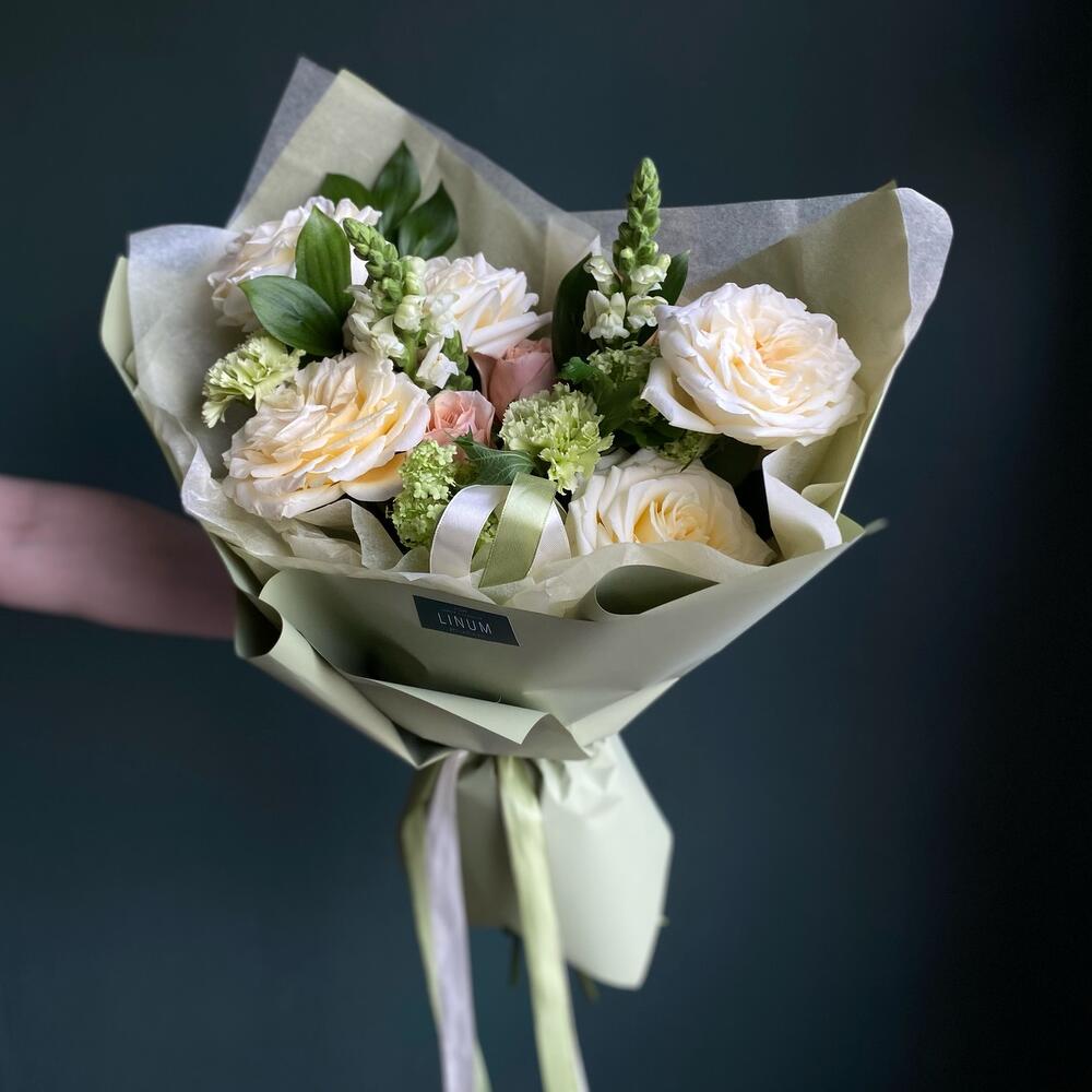 кендилайт – 5 шт.Вибурнум – 1 шт.Рускус – 3 шт.антиринум – 3 шт.Гвоздика – 3 шт.Упаковка дизайнерская – 1 шт.уходовое средство для цветов – 1 шт.транспортировочная упаковка – 1 шт.роза кустовая шиммер – 3 шт.