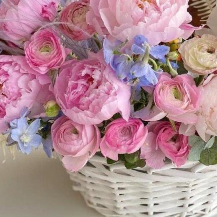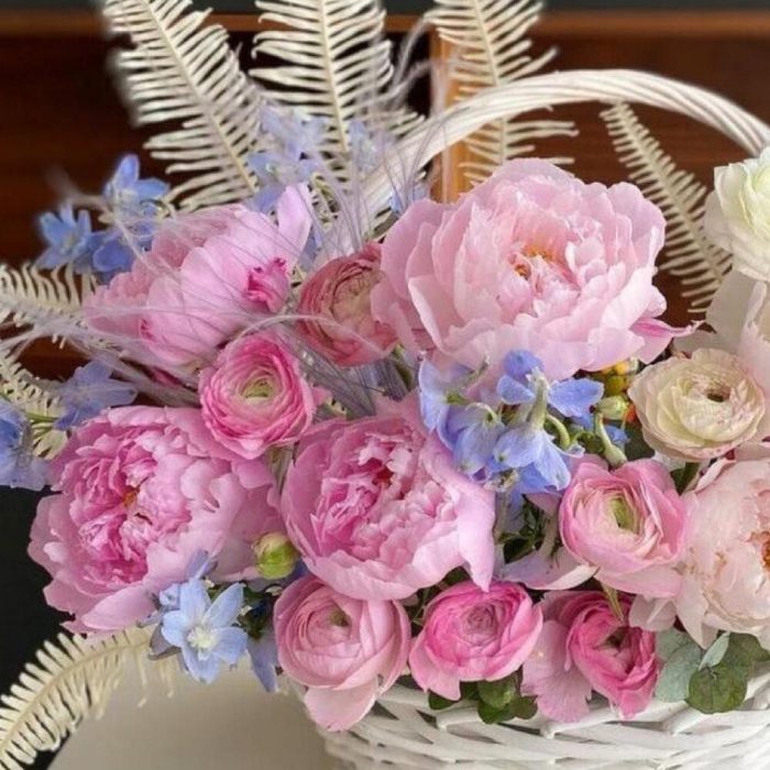 Пион – 7 шт.Листья папоротника – 9 шт.рануекулюс – 13 шт.Дельфиниум – 9 шт.Сухоцветы – 3 шт.Корзина плетеная – 1 шт.Оазис – 1 шт.Лента атласная – 2 шт.Открыточка с вашими пожеланиями – 1 шт.хорошее настроение – 100 шт.инструкция по уходу за цветами – 1 шт.Кризал – 1 шт.